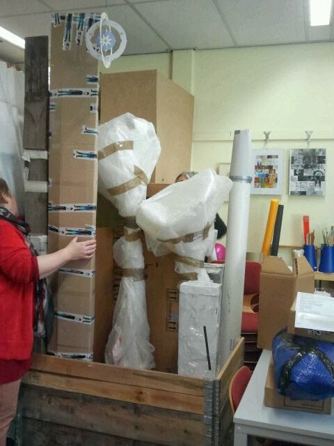 Kunstwerken van een aantal leden van de Vilkontaktgroep staan klaar in het atelier van Leny voor de reis naar een bijzondere expositie in Farfield Mill in Engeland. Het werk ‘Traces’ (middelste foto) van mij is onderdeel van de expositie.