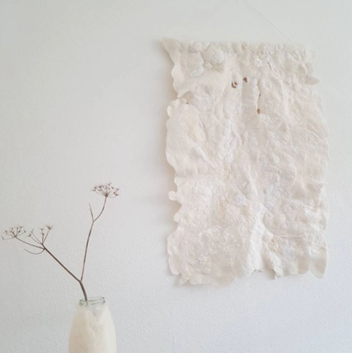 Kunstwerk ‘Structured’, gemaakt van zachte wol met zijdevezels erin verwerkt. Deze art piece is gemaakt met de natvilttechniek. Ik gebruik olijfzeep, warm water en mijn handen om op ambachtelijke wijze de wol te vervilten.